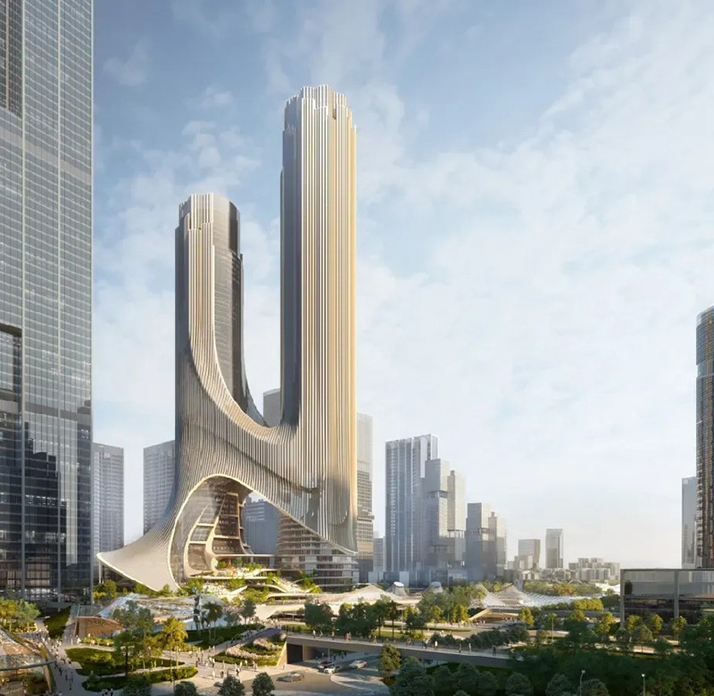 C塔被稱為“未來之塔”,位于深圳市南山區深圳灣超級總部基地的“十字雙軸”中心,總投資約165億元,占地面積3.6萬平方米,由高約395米和300米的兩座摩天樓共同組成的一座多維度“垂直都市”,呈“雙人起舞”的形體。