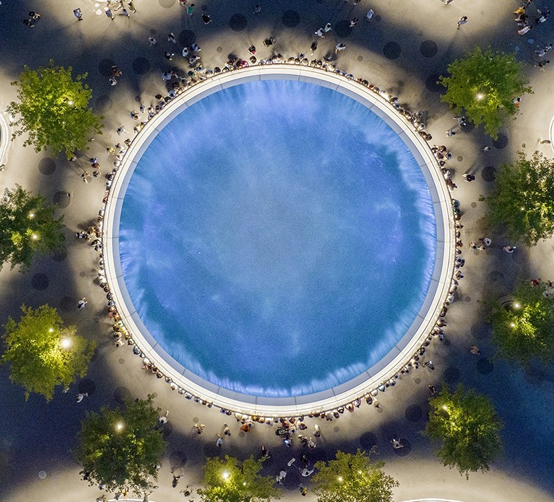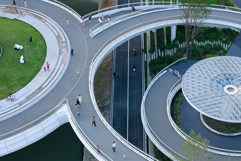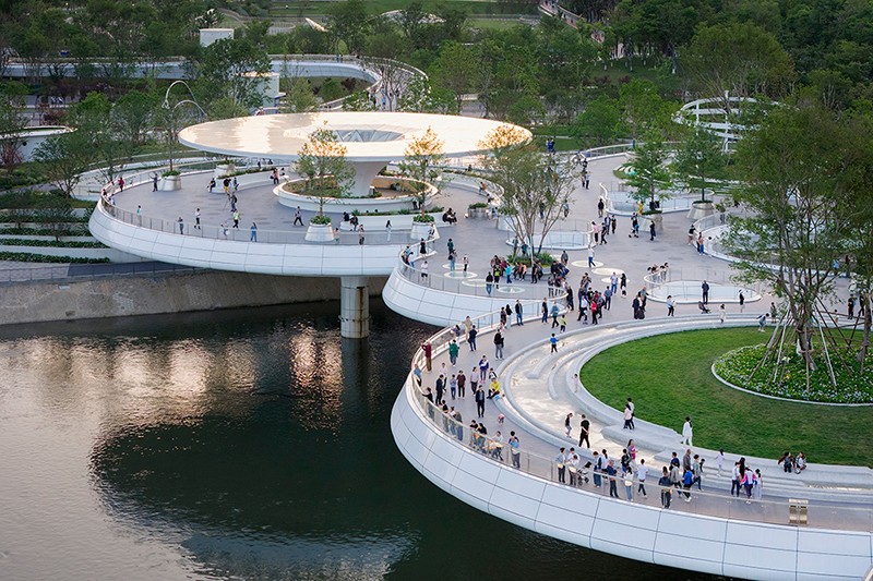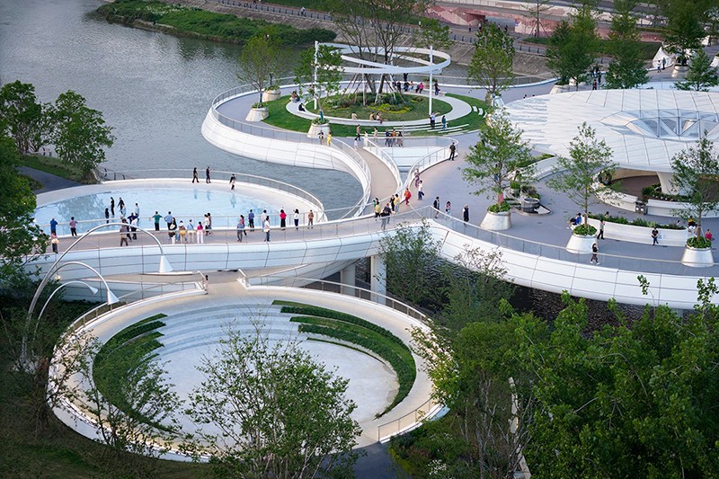 值得一提的是,橋上的 9 個圓盤單元雖大小各異,面積從 300 至 1600 平方米不等,但皆為同形異構。圓盤之上精心栽種喬木,使之與河岸綠地綿延相連,仿若一座漂浮于錦江之上的空中公園。這 9 個圓盤單元既相互關聯,構成一個完整的景觀整體,又各自獨立,分化出 9 處風格迥異、功能多樣的活動空間,全方位滿足市民休閑、娛樂、社交等多元需求。