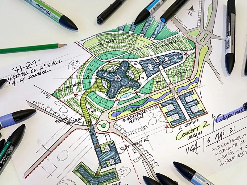 略性地分布在醫院附近,呈同心帶狀,以大型樹籬為界,50% 的停車位覆蓋草坪,以促進土壤排水。沿這些同心帶種植了樹木。垂直景觀設計也非常突出。屋頂花園,包括一個藥用花園,點綴著生態區,為護理人員和病人提供了一個共享空間。