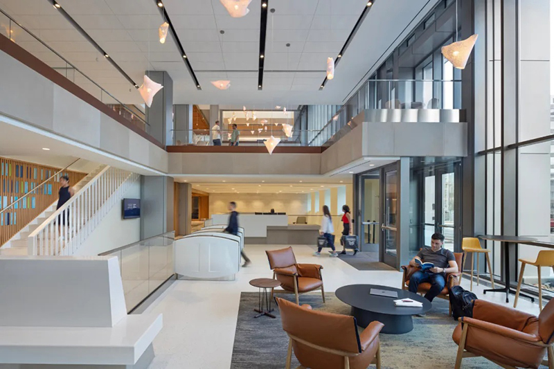 羅伯特-A-M-斯特恩建筑設計事務所(RAMSA)為位于華盛頓市中心喬治敦大學國會大廈校區的麥考特公共政策學院設計了一座新的旗艦建筑。這座新建筑占地 150,000 平方英尺,位于西北部 125 E 街,是學生、教師、研究人員以及活躍在美國首都的廣大決策社區的學術中心。大樓內有大量的教育和社區空間,包括 20 間教室、一個寬敞的主公共空間、學術辦公室、一個可容納 400 人的禮堂,以及一個可俯瞰美國國會大廈全景的大型屋頂露臺和一個可容納 280 人的會場。作為一個致力于應對復雜的國家和國際挑戰的學術中心,麥考特公共政策學院將可持續發展和能源效率放在首位,其設計目標是獲得 LEED 白金級認證。此外,由建筑師、設計師、藝術家和雕塑家瑪雅-林(Maya Lin)設計的一系列針對特定場所的原創裝置,鼓勵建筑使用者考慮周圍的自然環境。作為國會大廈校區的旗艦建筑,麥考特學校是喬治城市中心文脈和連貫性的延伸。125 E St.是一座由石材、鑲板金屬和玻璃幕墻組成的立方體建筑,其外形和規模與周邊建筑一脈相承。垂直鰭片和磚砌底板--主要用于遮擋陽光并優化熱性能--用凸出的線條勾勒出建筑的立面,與鄰近的西北第一街 500 號的統一沖孔窗戶遙相呼應。然而,麥考特學院的 125 E St. 建筑則通過金屬、石材和玻璃的交錯使用,引入了新的視覺趣味。麥考特公共政策學院的內部建筑是由其獨特的地理位置所提供的教育機會所決定的,即靠近美國國會大廈和最高法院等國家主要決策機構。可容納 400 人的禮堂具有廣播功能,屋頂場地可容納 280 人,可接待主要的政策制定者和從業人員,進行與國家和國際政策制定相關的重要討論。大樓的設計提倡有機互動和偶遇,以促進形成一個強大、互聯和包容的學術社區。瑪雅-林工作室(Maya Lin Studio)的一系列裝置作品名為 “映射我們在世界上的位置”(Mapping Our Place in the World),為室內空間增添了活力,使居住者置身其中,促使他們思考自己與更廣闊世界的聯系。“波托馬克河沿岸 "是一個安裝在天花板上的玻璃大理石作品,仿佛鳥瞰波托馬克河流域。在主公共區,一系列名為 “是否有鳥 ”的天氣響應吊燈會根據陽光、云朵、雪或雨的存在而改變顏色。當地水道、濕地、森林和草地在一天和一年中不同時間的錄音,通過主樓梯上方的定向揚聲器播放。林還參與了建筑屋頂景觀的設計。“空中花園 "是一個帶有橢圓形水池和本地植物的室外露臺。它為人們提供了安靜交談和休憩的機會,同時還弘揚了地區生態,并將美國國會大廈的美景盡收眼底。