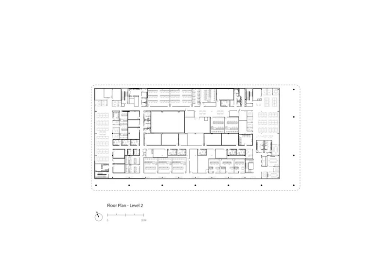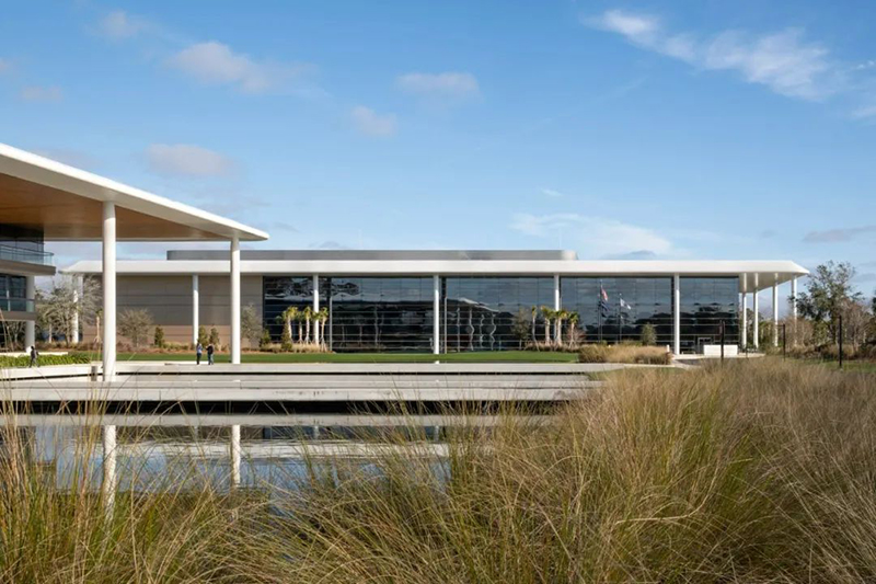 這座新建筑位于TPCSawgrass球員體育場球場南側(cè),緊鄰 PGA巡回賽總部大樓,后者也是由 Foster +Partners 設(shè)計。建筑采用與總部一致的設(shè)計語言,南、東立面設(shè)有寬敞的柱廊,大型懸挑屋頂提供遮蔭,同時,玻璃幕墻確保了充足的自然采光,并可眺望水景及周邊園區(qū)。園區(qū)內(nèi)設(shè)有景觀步道連接兩座建筑,方便員工與訪客通行。建筑材料選用白色金屬、混凝土與玻璃,以保持整體風格的協(xié)調(diào)統(tǒng)一。