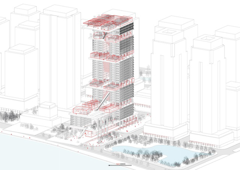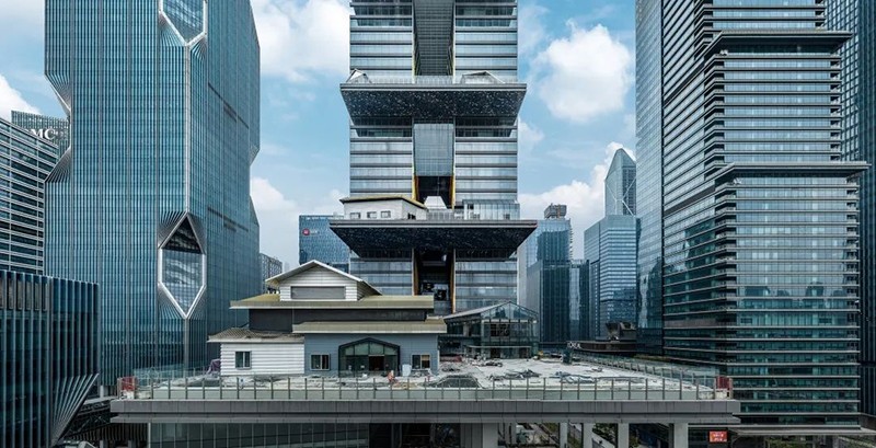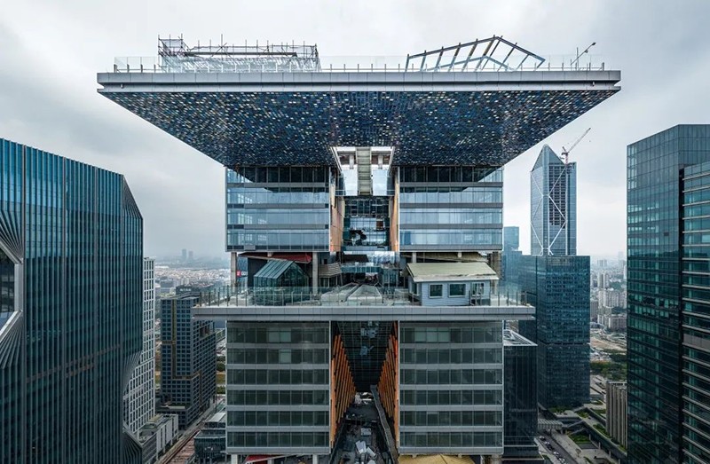 其標志性設計包括4道單邊懸挑景觀平臺,形似“火箭發射臺”,創下國內超高層直挑結構首例。